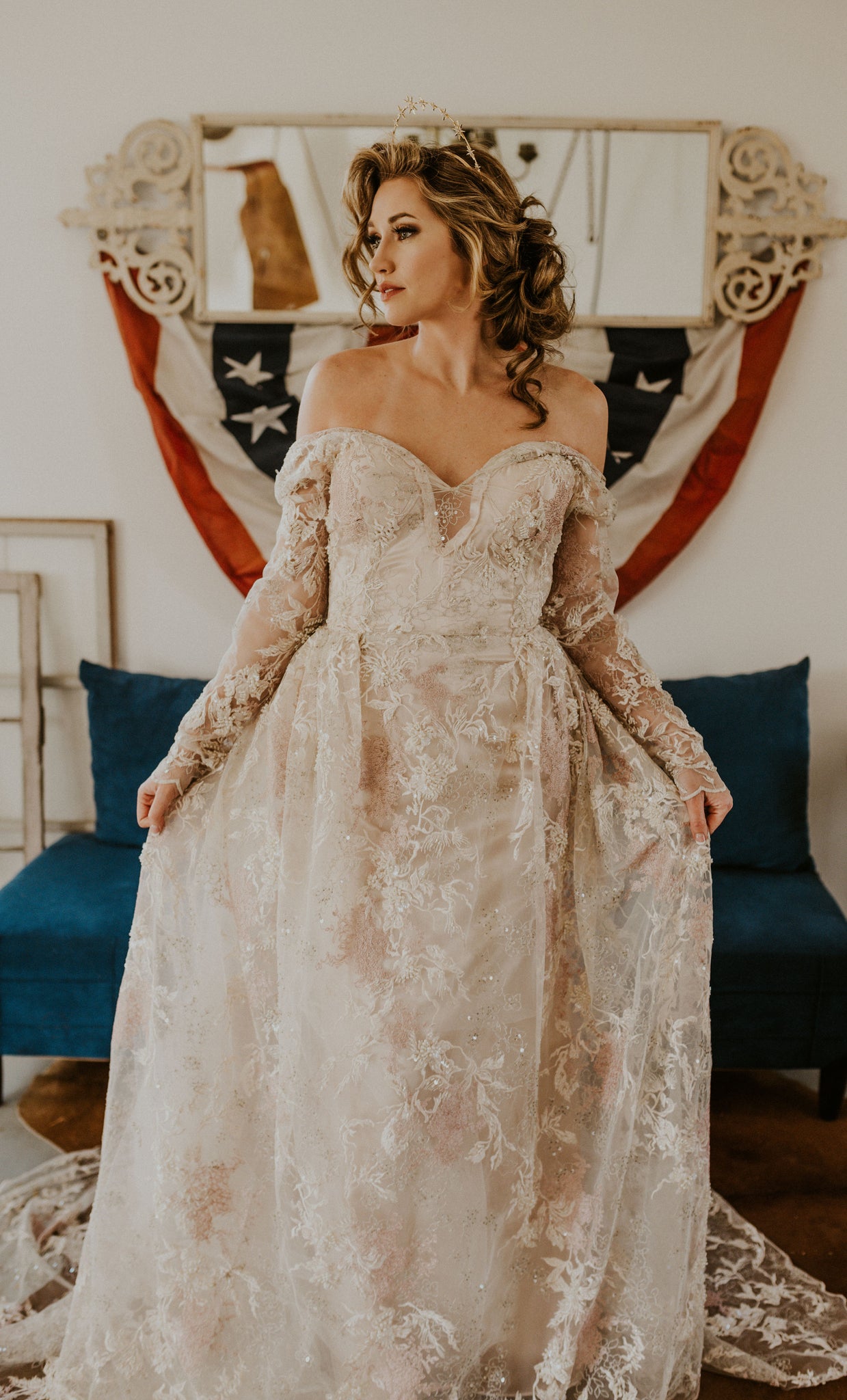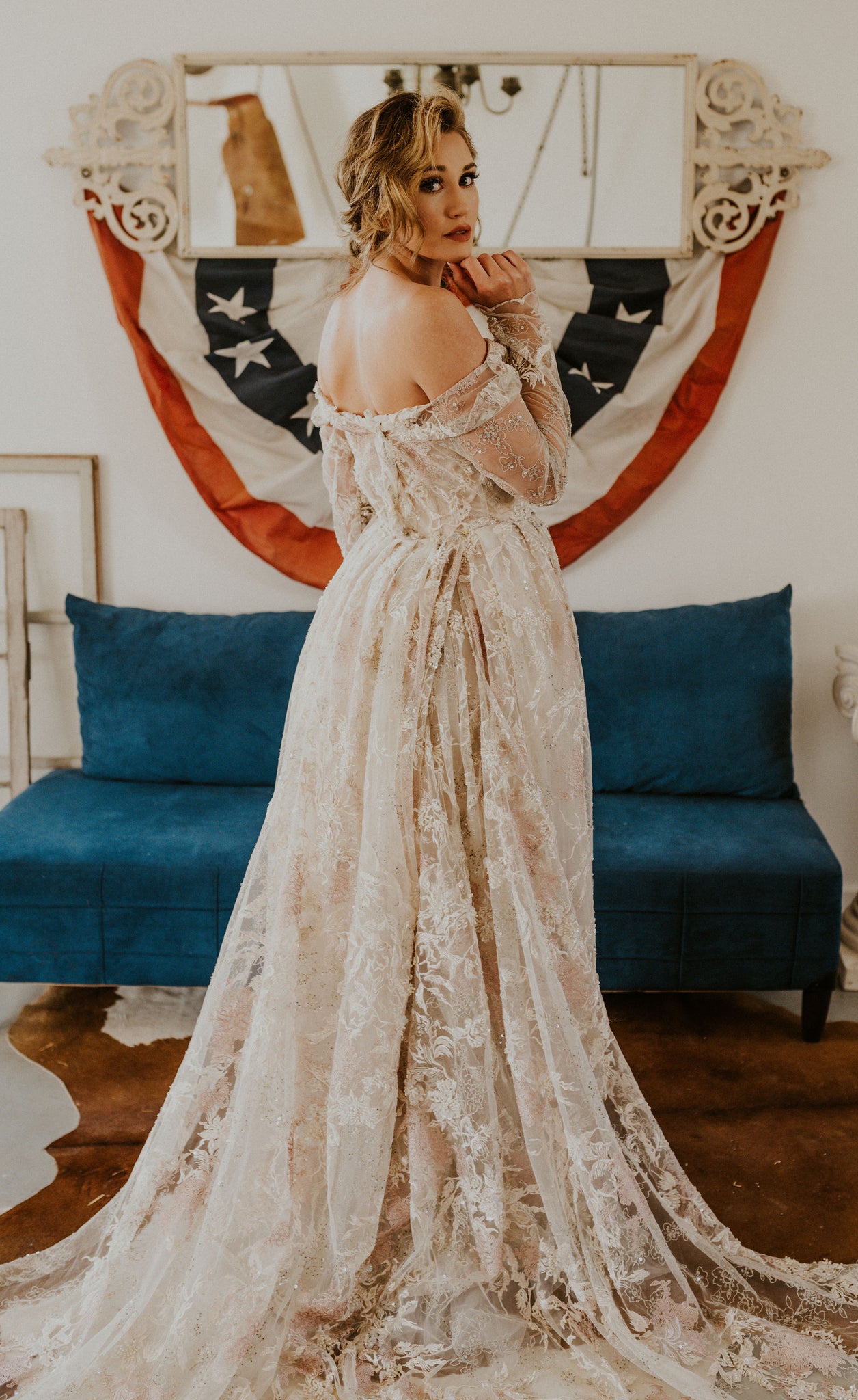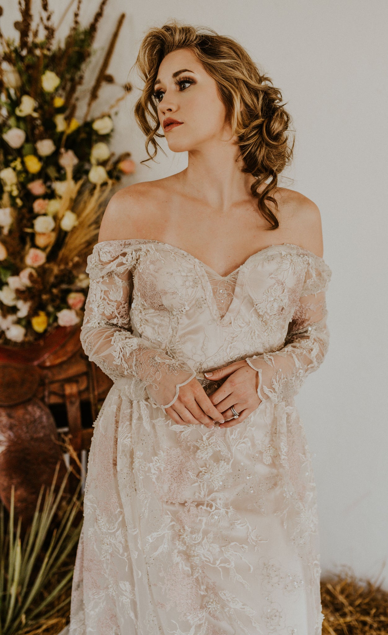 This gown is truly a show stopper. fully beaded gown with train velvet pink under bodice and off the shoulder sweetheart neck line. Long sleeve, ball gown with a penciled skirt front.